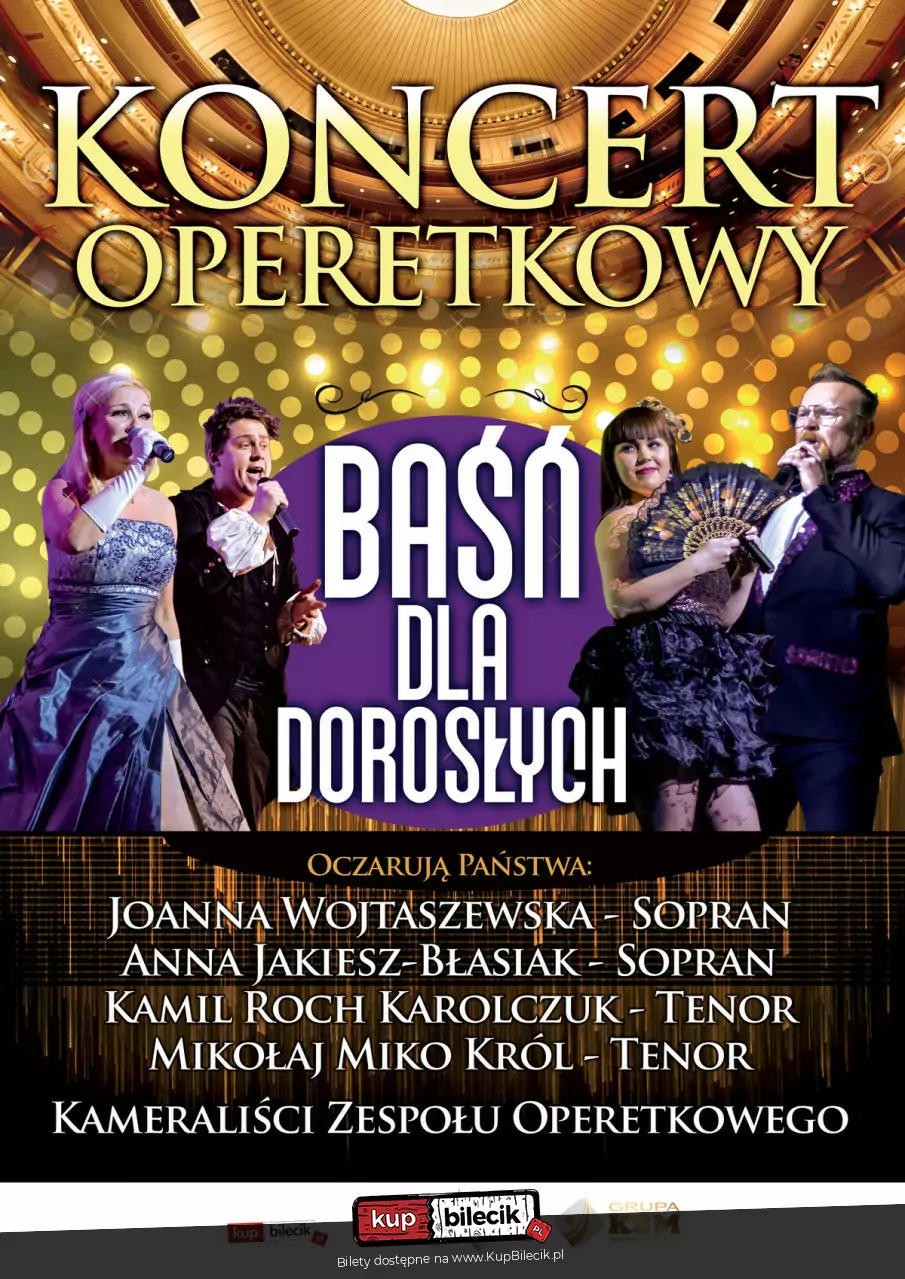 OPERETKOWA Baśń dla dorosłych odbywa się w całej Polsce. Za sprawą wspaniałych artystów przeniosą się Państwo do cudownego i wyjątkowego świata, pełnego miłości, czułości, wzruszeń, namiętności, gorących pocałunków... Usłyszycie Państwo najpiękniejsze i najznakomitsze melodie. Zabrzmią duety wszech czasów, wspaniałe arie, popisowe utwory instrumentalne a to wszystko podane na najwyższym poziomie. Gwiazdą wieczoru i wisienką na torcie będzie gwiazdorska niespodzianka - show w innej odsłonie. Gala cieszy się wielkim powodzeniem i uznaniem, za sprawą porywających solistów, ich poruszającej i subtelnej gry scenicznej, tańca, fantastycznego kontaktu z publicznością oraz wdzięku i uroku osobistego a do tego niesamowitej wrażliwości oraz muzykalności. Repertuar zaczerpnięty z najbardziej znanych i lubianych melodii. Śpiewakom towarzyszą wspaniali Kameraliści Operetkowi, składający się z wybitnie uzdolnionych artystów nowego pokolenia muzycznego. Koncert jest dedykowany każdemu, kto kocha piękną, melodyjną muzykę i jest gotów by szeroko otworzyć swe serce na nowe, muzyczne i nie tylko, doznania. Zapraszamy do wspólnego muzykowania. Do zobaczenia i usłyszenia. Obsada: Joanna Wojtaszewska - Sopran Anna Jakiesz - Błasiak - Sopran Kamil Roch Karolczuk - Tenor Mikołaj Miko Król - Tenor Kameraliści Operetkowi Czas trwania koncertu: ok.90 minut fantastycznej zabawy (bez przerwy).Czytaj więcej na: https://www.kupbilecik.pl/imprezy/105574/%C5%BByrard%C3%B3w/Operetkowa+ba%C5%9B%C5%84+dla+doros%C5%82ych/