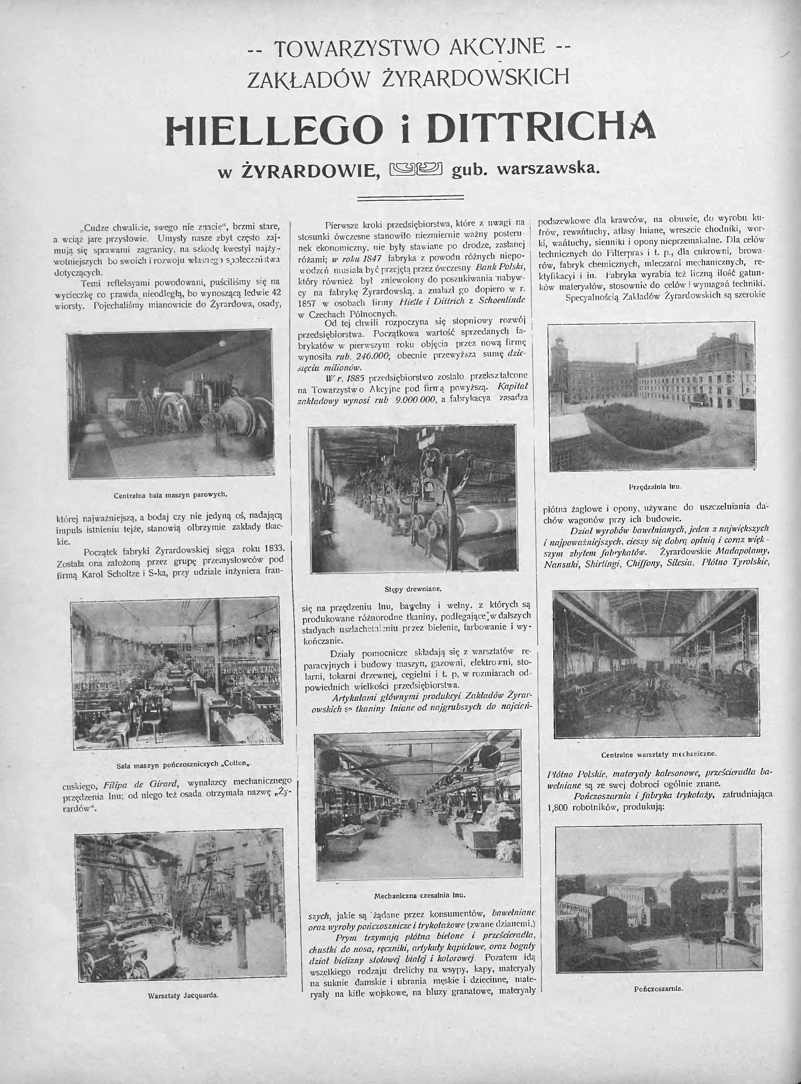 Komputer znalazł to już któryś raz, wstawiam artykuł na temat Zakładów Lniarskich w Żyrardowie z 1908 roku ze wspaniałymi ilustracjami. Najbardziej fascynująca jest maszynownia parowa, ciekawe w którym to było miejscu.Artykuł pochodzi z Tygodnika Ilustrowanego nr 33 z 1908 roku. Warto zwrócić uwagę, że już wtedy w 1908 roku pisali, że produkty działu wyrobów bawełnianych odnoszą sukces, dzisiaj tego nigdy nie mówią służby upamiętniające naszą fabrykę, tylko len, len len... Walory użytkowe bawełny były wyższe niż lnu i przeważyły nad lokalnym patriotyzmem.